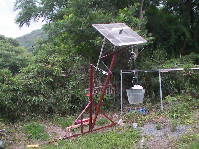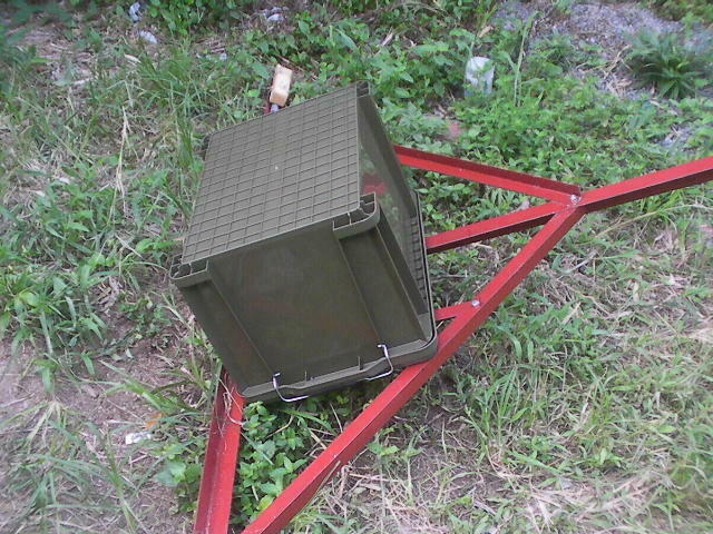 432実験用枠にRL・LNA・ケーブルなどを想定してバケツに2kgの鉄くずを追加して 動きをみてみる。問題は無い。 実際は取り付け角度を考慮するとコンナに高くは上げる必要は無い。JA1WQF笠井さんお勧めの透明塗料を塗布。