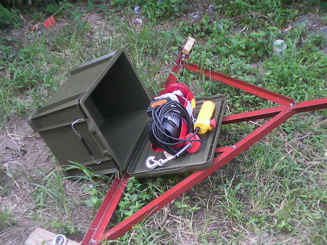 戻り梅雨とやらに見舞われて全国で水害続出。 やっと 本当の梅雨明け。位置決めが始まる。 その間 考えが変わって ウインチにも防水箱をつけて常設とすることにした。 (2022.07.22.)