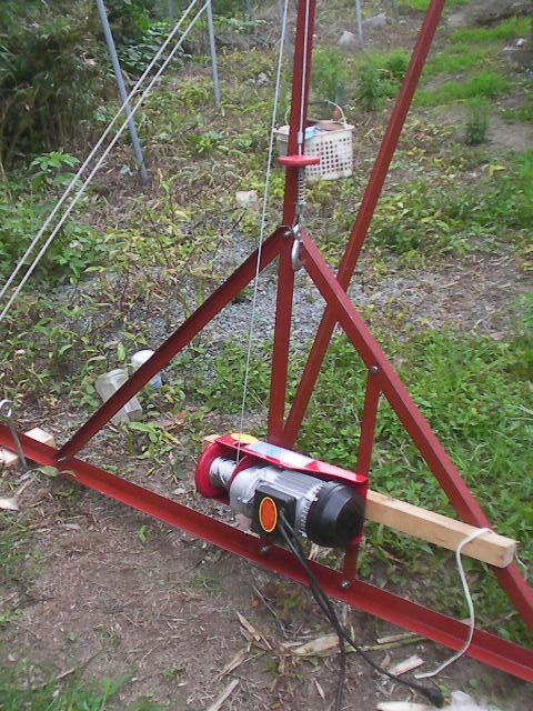 電動ウインチは10kgあるが、全体を手前に倒し、電動ウインチの重量を地面にゆだねると 40X40の かんぬき棒は楽に抜き差しできる。