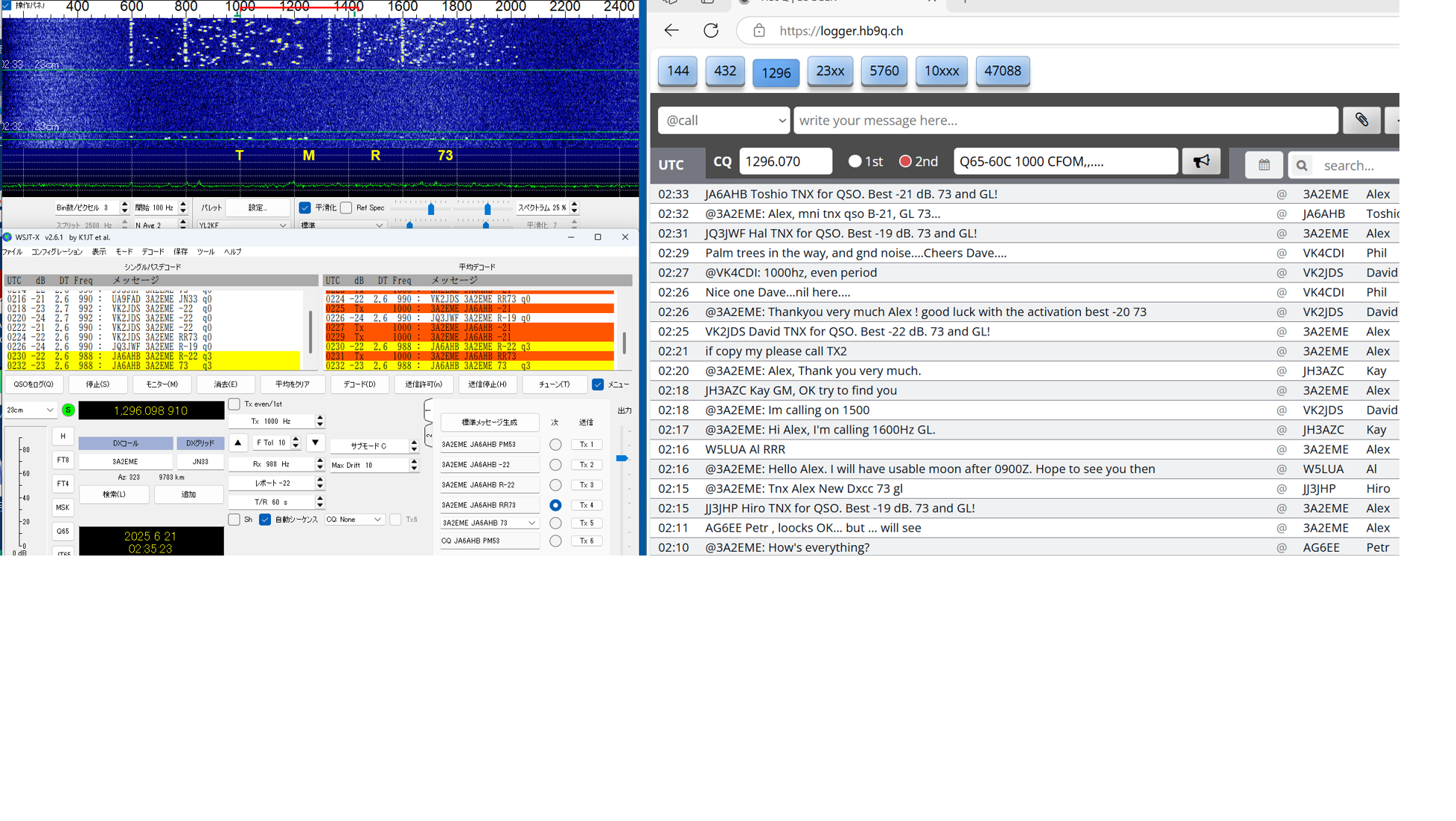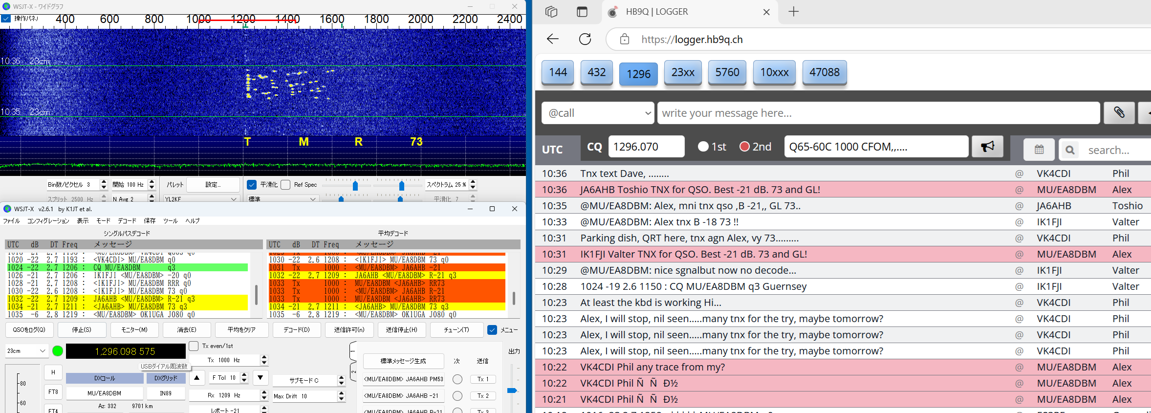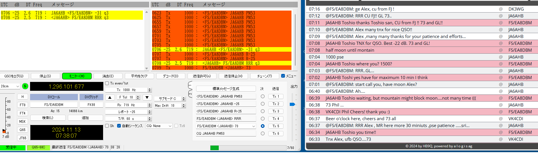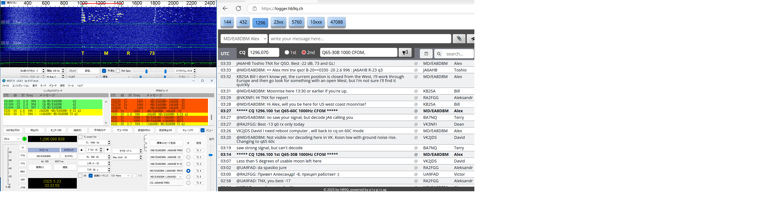 QSLを書く段階で、同じSebのDX pediがあった時もclublogに入会したことがあったのを想い出したが、メモが 足りなくて、現行会員かどうか不明のまま、再度入会QSLrequestもして、念のためQSLcardを作って送った。 LoTW にて confirmed TNX! ------------------------------------------------- 23#100 2023/11/24 CT9/EA8DBM(Alex, Madeira Is.) ct9-eb8dbm1 2.png 以前からmmmVHFで狙いをつけていたのですが、いざ11/19コールしても何もトレースがない、聞くと、曇って いて月が見えないとのお言葉。11/23になっても状況が変わらず、月が見えないと言っているがEUの数局とは 交信できている模様(loggerで)。しびれを切らしてEmailを発動!。彼の位置の南中時間を教えてこのときの 影の方向が真北だからあとはwsjtxの追尾データに合わせるだけだ。1.8mdishのビームならこれで間に合う。 と。ところが、ズット曇っていて、影など見えない・・と仰る。では、垂直に張ったお錘をつけた糸とのELをデータ に時間ごとに合わせれば、あとはAZのみを追えば半分は正確に追尾できる。・・・と返事した。 その甲斐あってか お天気が回復して月が見えたのか解からないが、11/24にはトレースがはっきり見えて めでたく交信出来ました。 LoTW にて confirmed TNX! ----------------------------------------------- 23#101 2023/11/26 HG5BMU (Csaba, Hungaly) HG5BMU 2 2.png 11/25タヌキを決め込んでEUを見ていたらこのコールをHB9Qloggerから見つけました。 時すでに遅く、私の月は沈んでいました。Csabaさんへ早速メール、明日会いましょうと。 11/26 共通窓が開いても彼からのコールはloggerに現れません・・・。お天気の悪化か 前日の疲れから立ち上がれないのか・・・。諦めかけて、以前から気になっていた落雷の トバッチリを逃れるために設置していたTS2KとPC間のコネクターのルーコンを探索して ここか!というところを見つけて分解を始めた時、loggerでは彼が誰かと交信していた・・ はらわたを出したままソロット!!数回応答するとレポートあり・・。一発で交信完了!。 まさに神業・・。自動になっていた事も幸いしてTX停止まで無事終了。神様の思し召し。