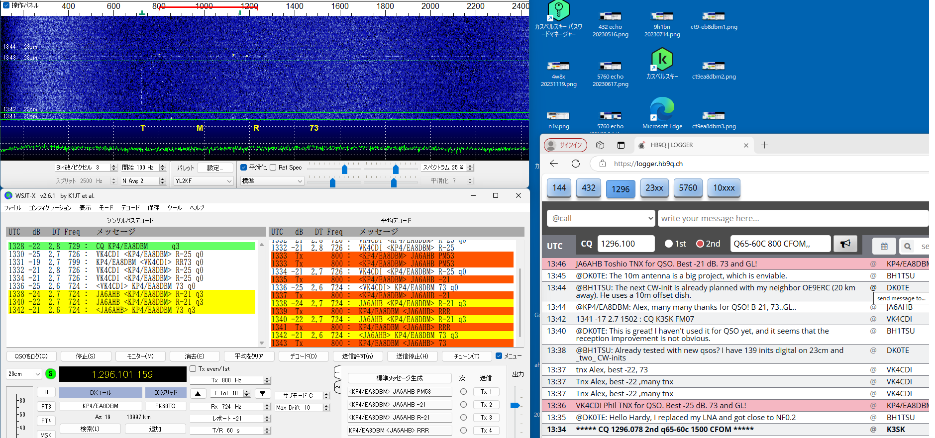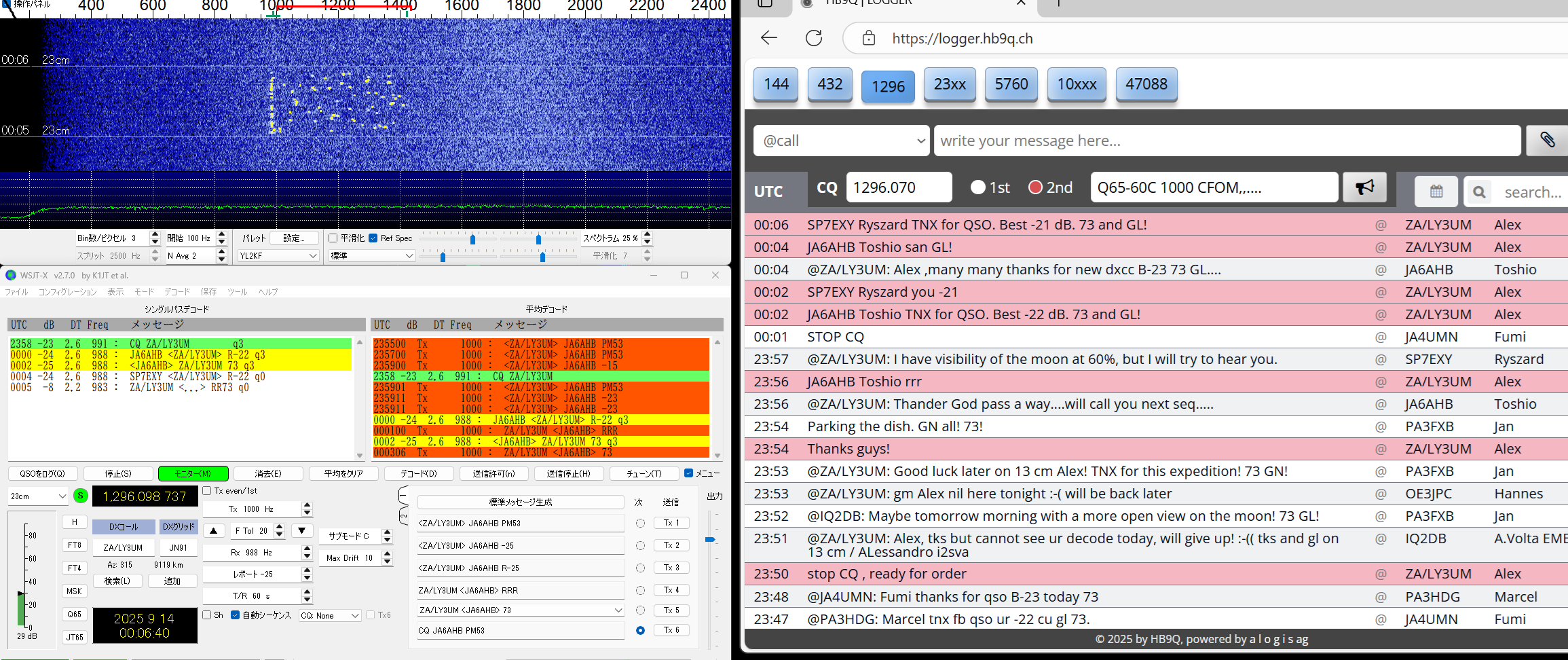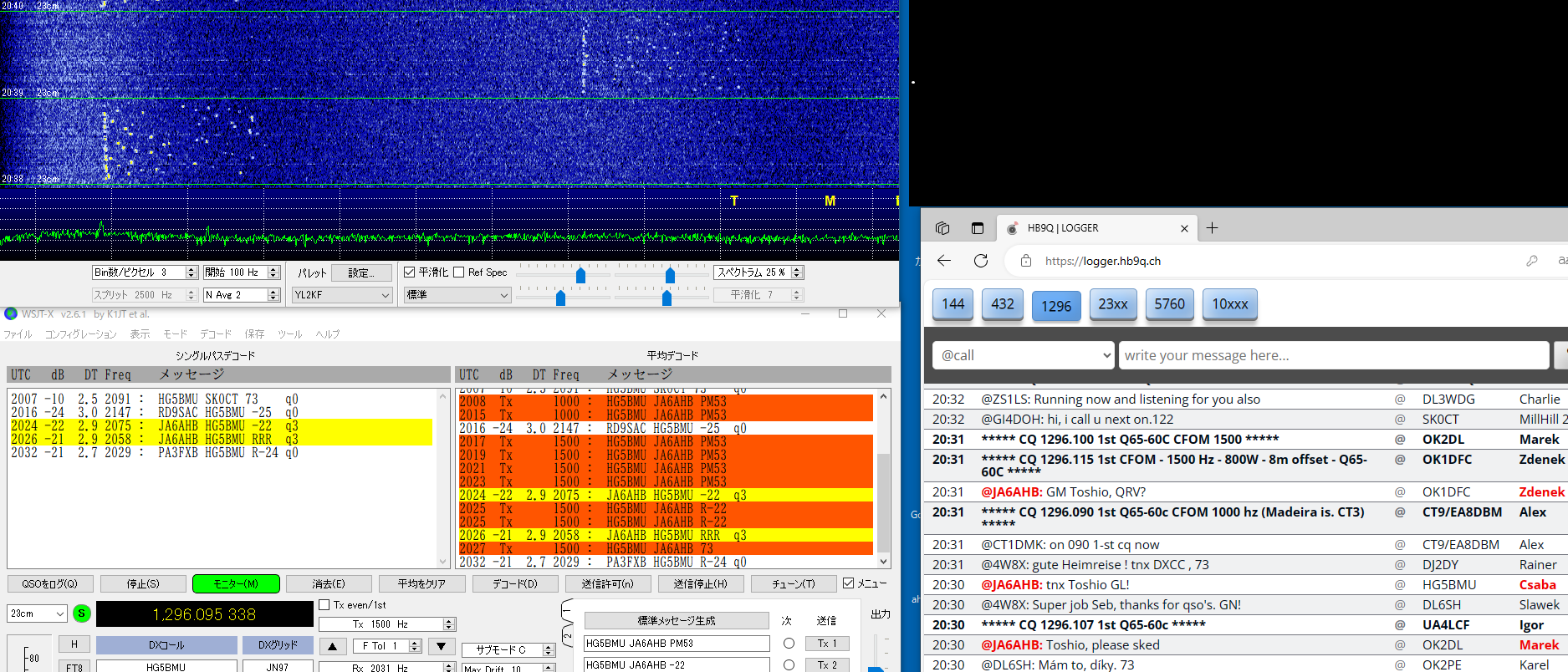 QSLを書く段階で、同じSebのDX pediがあった時もclublogに入会したことがあったのを想い出したが、メモが 足りなくて、現行会員かどうか不明のまま、再度入会QSLrequestもして、念のためQSLcardを作って送った。 LoTW にて confirmed TNX! ------------------------------------------------- 23#100 2023/11/24 CT9/EA8DBM(Alex, Madeira Is.) ct9-eb8dbm1 2.png 以前からmmmVHFで狙いをつけていたのですが、いざ11/19コールしても何もトレースがない、聞くと、曇って いて月が見えないとのお言葉。11/23になっても状況が変わらず、月が見えないと言っているがEUの数局とは 交信できている模様(loggerで)。しびれを切らしてEmailを発動!。彼の位置の南中時間を教えてこのときの 影の方向が真北だからあとはwsjtxの追尾データに合わせるだけだ。1.8mdishのビームならこれで間に合う。 と。ところが、ズット曇っていて、影など見えない・・と仰る。では、垂直に張ったお錘をつけた糸とのELをデータ に時間ごとに合わせれば、あとはAZのみを追えば半分は正確に追尾できる。・・・と返事した。 その甲斐あってか お天気が回復して月が見えたのか解からないが、11/24にはトレースがはっきり見えて めでたく交信出来ました。 LoTW にて confirmed TNX! ----------------------------------------------- 23#101 2023/11/26 HG5BMU (Csaba, Hungaly) HG5BMU 2 2.png 11/25タヌキを決め込んでEUを見ていたらこのコールをHB9Qloggerから見つけました。 時すでに遅く、私の月は沈んでいました。Csabaさんへ早速メール、明日会いましょうと。 11/26 共通窓が開いても彼からのコールはloggerに現れません・・・。お天気の悪化か 前日の疲れから立ち上がれないのか・・・。諦めかけて、以前から気になっていた落雷の トバッチリを逃れるために設置していたTS2KとPC間のコネクターのルーコンを探索して ここか!というところを見つけて分解を始めた時、loggerでは彼が誰かと交信していた・・ はらわたを出したままソロット!!数回応答するとレポートあり・・。一発で交信完了!。 まさに神業・・。自動になっていた事も幸いしてTX停止まで無事終了。神様の思し召し。