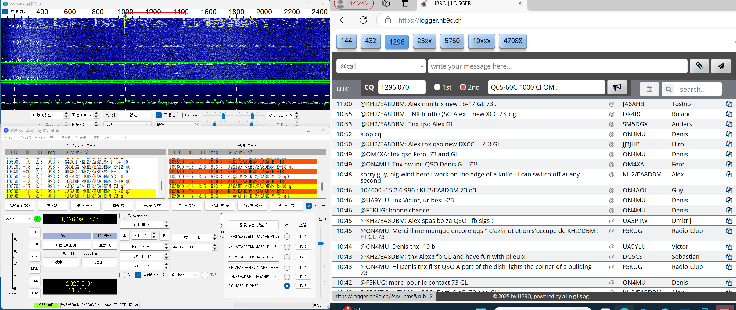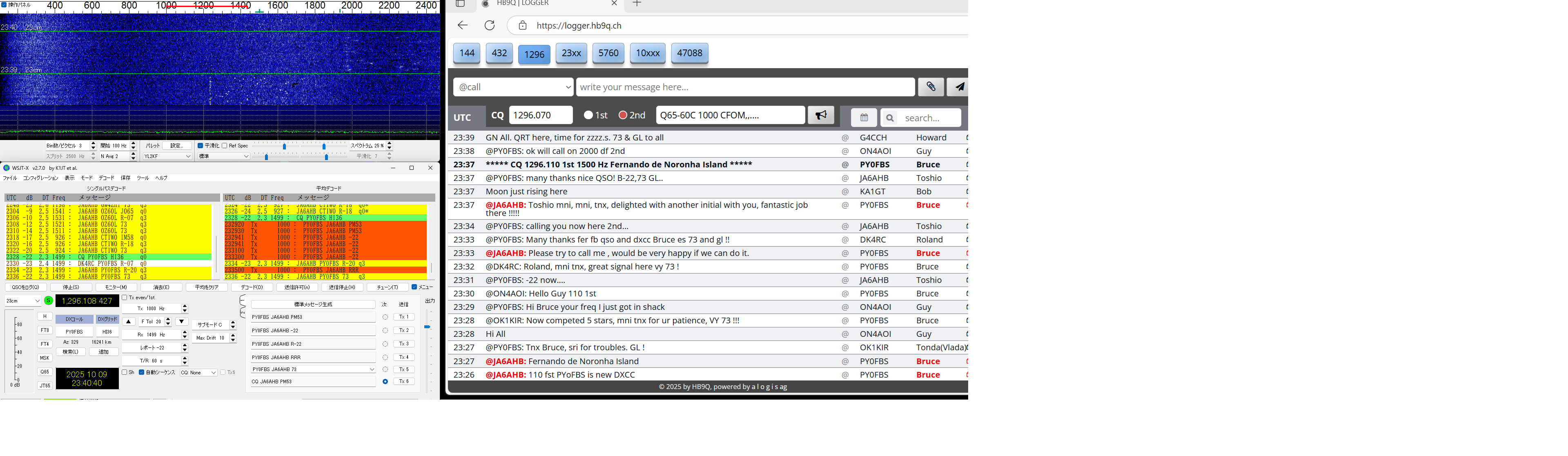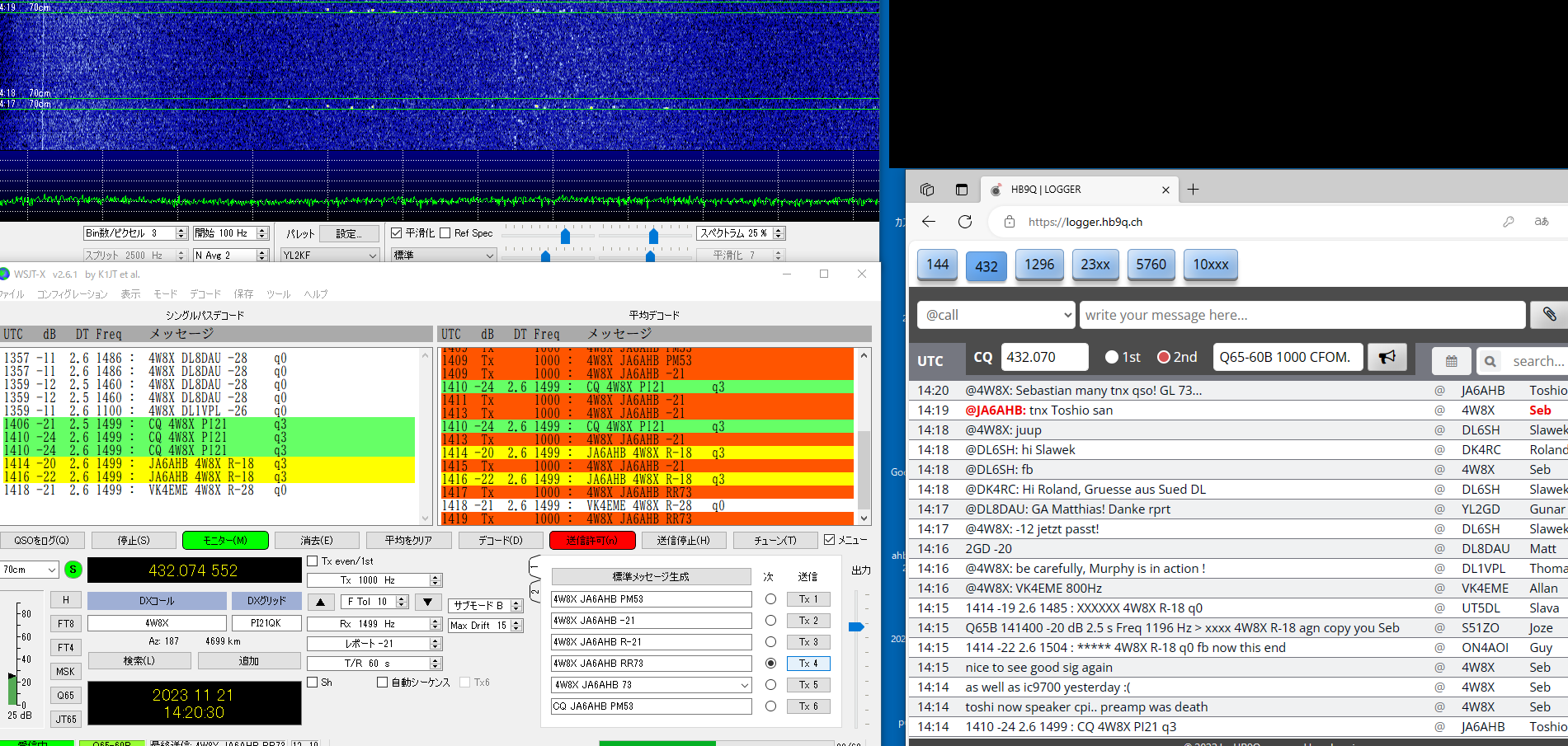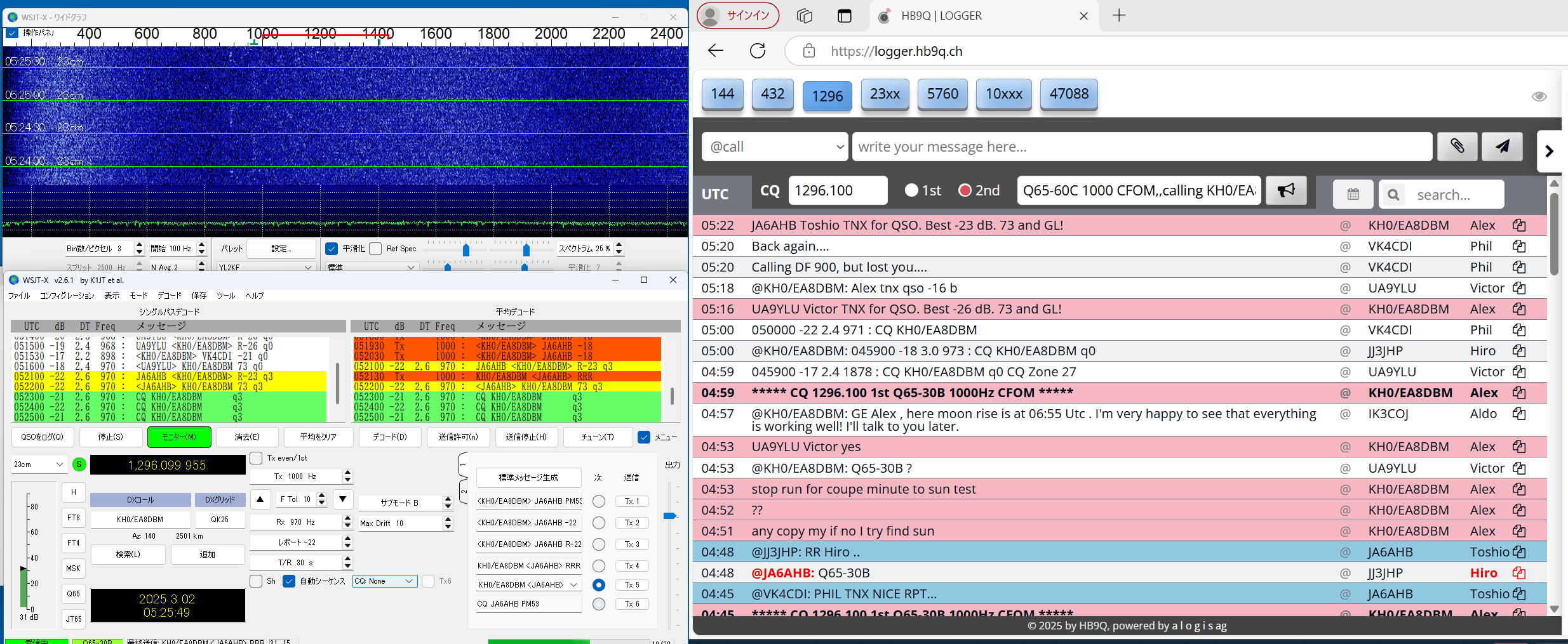 QSLを書く段階で、同じSebのDX pediがあった時もclublogに入会したことがあったのを想い出したが、メモが 足りなくて、現行会員かどうか不明のまま、再度入会QSLrequestもして、念のためQSLcardを作って送った。 LoTW にて confirmed TNX! ------------------------------------------------- 23#100 2023/11/24 CT9/EA8DBM(Alex, Madeira Is.) ct9-eb8dbm1 2.png 以前からmmmVHFで狙いをつけていたのですが、いざ11/19コールしても何もトレースがない、聞くと、曇って いて月が見えないとのお言葉。11/23になっても状況が変わらず、月が見えないと言っているがEUの数局とは 交信できている模様(loggerで)。しびれを切らしてEmailを発動!。彼の位置の南中時間を教えてこのときの 影の方向が真北だからあとはwsjtxの追尾データに合わせるだけだ。1.8mdishのビームならこれで間に合う。 と。ところが、ズット曇っていて、影など見えない・・と仰る。では、垂直に張ったお錘をつけた糸とのELをデータ に時間ごとに合わせれば、あとはAZのみを追えば半分は正確に追尾できる。・・・と返事した。 その甲斐あってか お天気が回復して月が見えたのか解からないが、11/24にはトレースがはっきり見えて めでたく交信出来ました。 LoTW にて confirmed TNX! ----------------------------------------------- 23#101 2023/11/26 HG5BMU (Csaba, Hungaly) HG5BMU 2 2.png 11/25タヌキを決め込んでEUを見ていたらこのコールをHB9Qloggerから見つけました。 時すでに遅く、私の月は沈んでいました。Csabaさんへ早速メール、明日会いましょうと。 11/26 共通窓が開いても彼からのコールはloggerに現れません・・・。お天気の悪化か 前日の疲れから立ち上がれないのか・・・。諦めかけて、以前から気になっていた落雷の トバッチリを逃れるために設置していたTS2KとPC間のコネクターのルーコンを探索して ここか!というところを見つけて分解を始めた時、loggerでは彼が誰かと交信していた・・ はらわたを出したままソロット!!数回応答するとレポートあり・・。一発で交信完了!。 まさに神業・・。自動になっていた事も幸いしてTX停止まで無事終了。神様の思し召し。