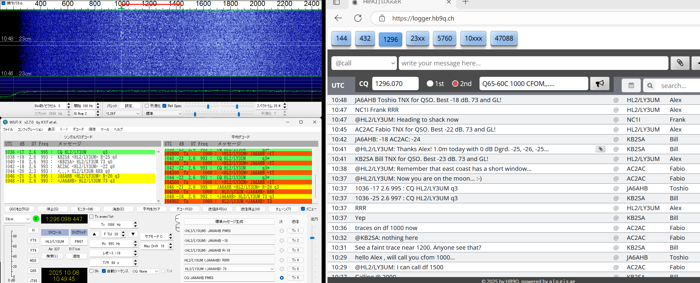 お隣り韓国に Alexの お成り・・・。長い間 韓国の23cm 待ちわびていました。 10月7日は 1回切り コールサインのみ loggerに 出てきたが 後は全くの音無しの構え。 10月8日は 予想しなかった 東向きから on Airが 始まった。 例によって曇っていて 月が見えないらしく pilotを求めてきた。 USAの2局の尻馬に乗って 離れて? 1000で Alexを呼ぶ。 3番目程に 呼ばれて 難なく QSO成功。 今回はラクチンでした。