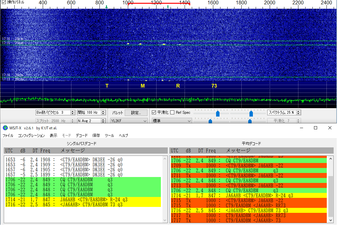いつものように欧米優先でなかなか相手にしてくれません。小言を言って彼らの月没に出るように 言いましたら 出てくれました。が、なかなか復調できません。こちらがギブアップを申し出ても 先方ではまだ月が半分見えているし 復調できているから も少し頑張りな!,とのこと。 頭を冷やしてよく見ると1000Hzではなくて755Hzでトレースが見えている!めでたしめでたし。
