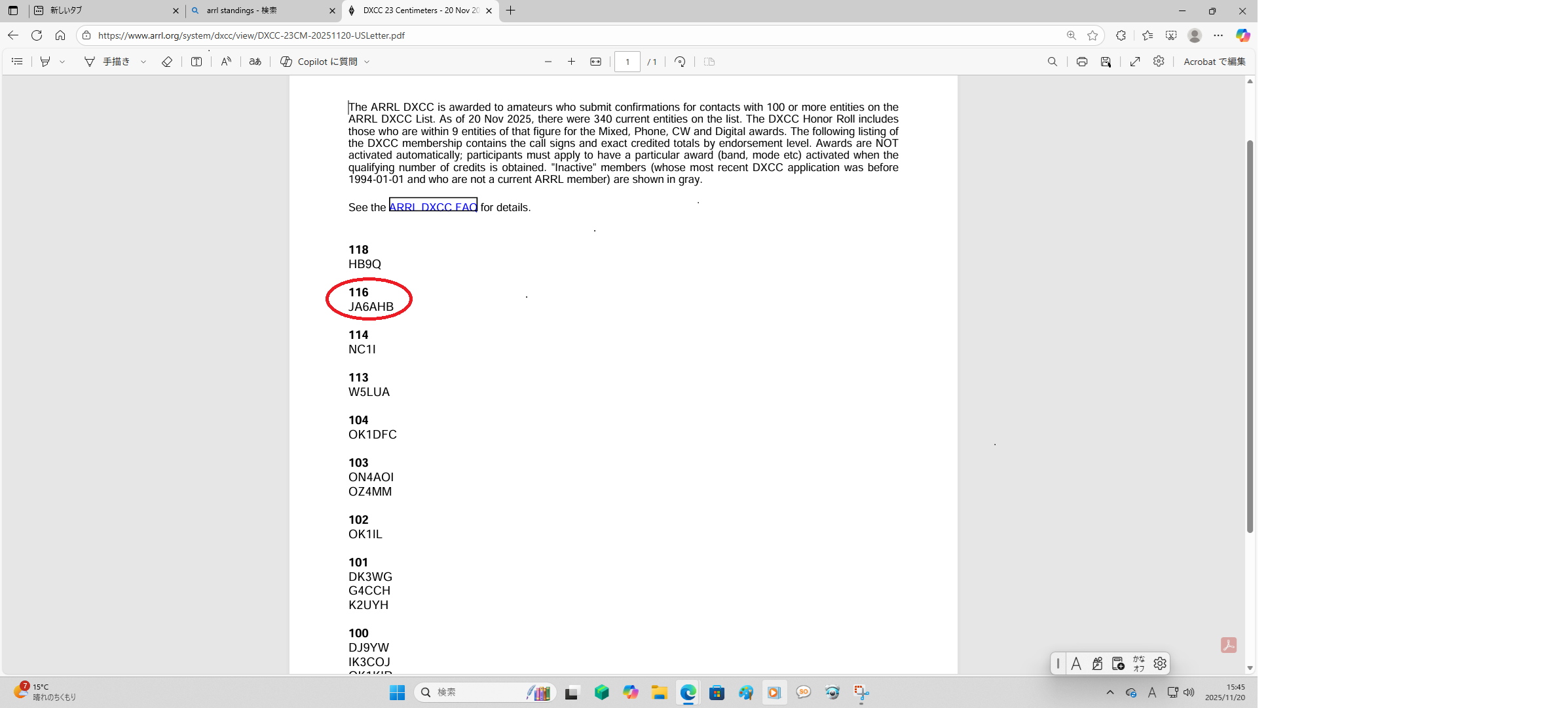 喜び勇んで LoTWからaward申請しようとするがドッコイ、どこから入っていいか 解からない。前田さんによると、エンドーズメントが残っていない場合はLoTWは 使えないのだそうだ。そこはDXCC百戦錬磨のオナーロール、裏の裏までご存知 の手の内をご披露していただき、紙申請書をPDF化してメール添付で申請を終える ことができた。前田さんのお力添えが無ければ今頃JAEMEあたりで騒いでいた かもしれない。101局クレジット確認から数時間でAWARD申請が出来たのは 有難い事でした。 (2月15日) 夜遅く Sharonさんから「おめでとう 23cm、数日中に賞状を送る」とメールあり。 バンザイ!今夜はよく眠れるぞ! 梅酒で乾杯!ウメーシュ・・・ (2月15日)
