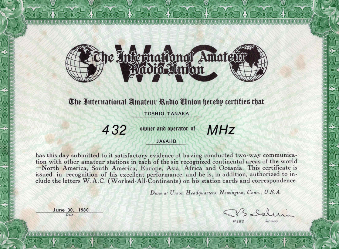 1. 432mHz WAC QSO all was 2way EME Apr. 20. 1980. worked in Kanoya PM51 ever 1st in Japan ever 1st in Asia No.16 in the world