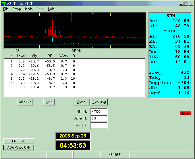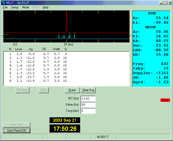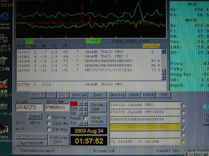 「JT44ってパソコン同士がQSOしたものを人間が横取りするわけでしょう・・・そんなの許せない・・・」 と久留米や太宰府のOMと話していたところ、8月3日にJA4BLCさんから「10W位でQ=10(満点)の エコーが得られた」とメールが入る・・・チョット待てよ、今のEMEは環境に恵まれた一部の特権?階級の もので人口が増えないのはCWと資格と電波環境にある・・・JT44はこれらを満たしてくれるのでは・・・。