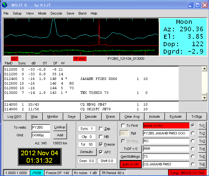 PY2BS〜JA6AHB 18,853km 2012.11.04 NEW EME Dx world record of 432. JT65B