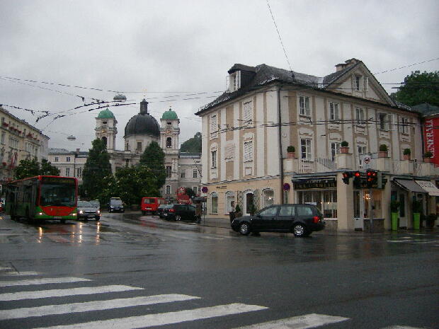 Johann Christian Dopplerの生家。 2007.Aug.09. AM rain. オーストリア、ザルツブルグ新市街、マルクト広場、 カラヤン記念館とその隣のモーツアルト住居跡記念館側より撮影。