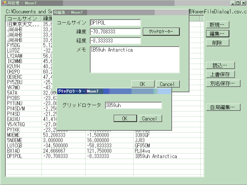 メイン画面のウィンドウから局管理を選び自局・相手局の必要データを整える。 グリッドロケーターを緯度経度に自動変換してくれる。