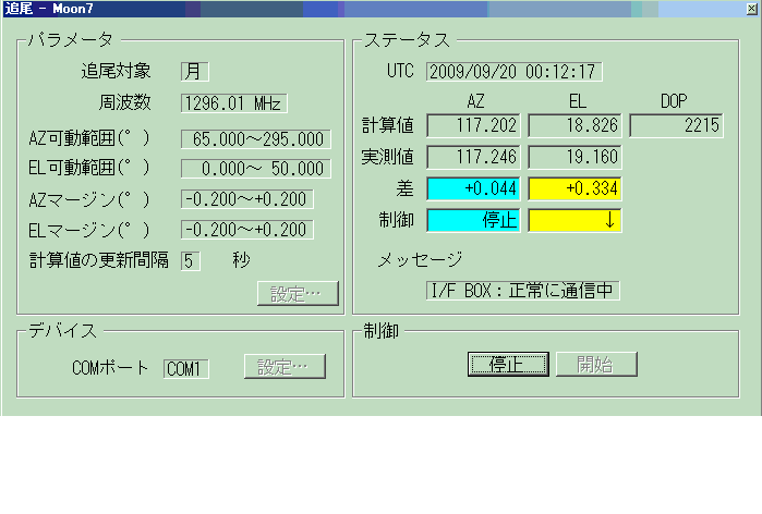 追尾が始まり、マージン内で有れば青で停止、でなければ黄色で駆動状態を示す。 Az・Elの可動範囲外では赤表示となり自動電源が入らないので手動SWで可動範囲へ動かす。