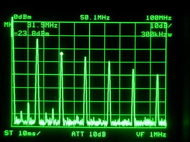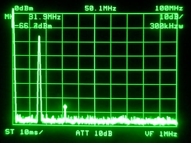 同上 出力1。 出力は単独で+4dBm。調整によって第2高調波はほとんど見えなくなる。