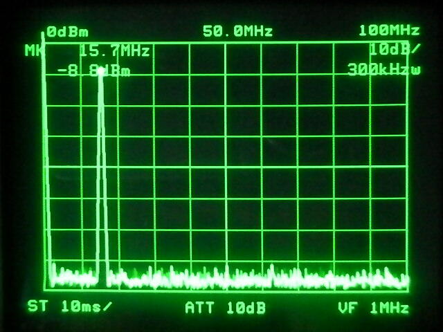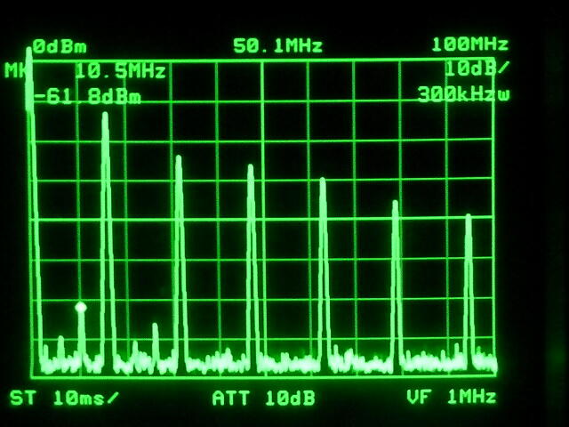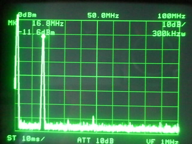 出力をウイルキンソン抵抗2分割しても0dBmを保持するようにampを挿入しました。 出力を0.5dB絞ると、2倍波が60dB以下となる得点もありました。 (2017.01.30) 1/4DEV をスルー(12dBup)にしても、10MHz漏れ・15.6MHz高調波に変わりは無い。