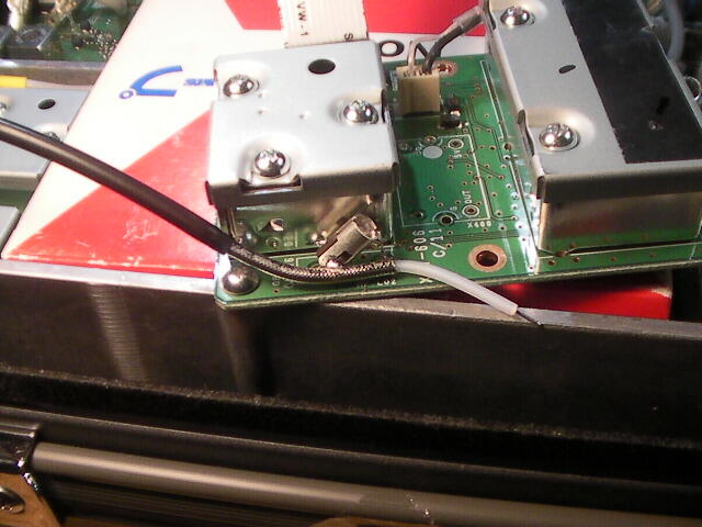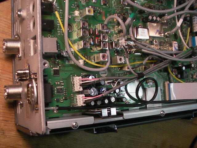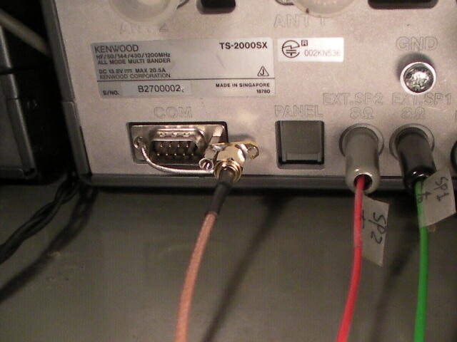 TS2000sx改造2台目裏・15.6MHz PLL入力の様子。com端子留めねじの片方をはずし、其のあいたねじ穴に0.085セミリジッド を通し、外したねじでSMA-Jを固定する。十分余裕を持たせて配線し整形した後の余分は内部で2から3cmのワンターンを作って 吸収する。 ==後日 WSJTX 制御のため com port が必要になり元に戻し、本体横の車載取り付け金具用ビス穴を利用==